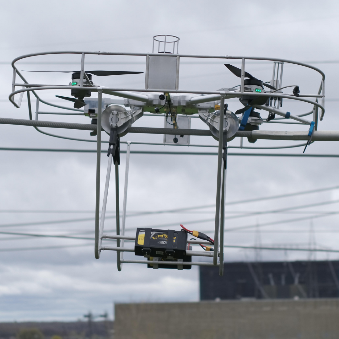 The drone operates on live lines, immunised to withstand the electromagnetic fields of 120 to 315 kV transmission lines up to 2000 A.