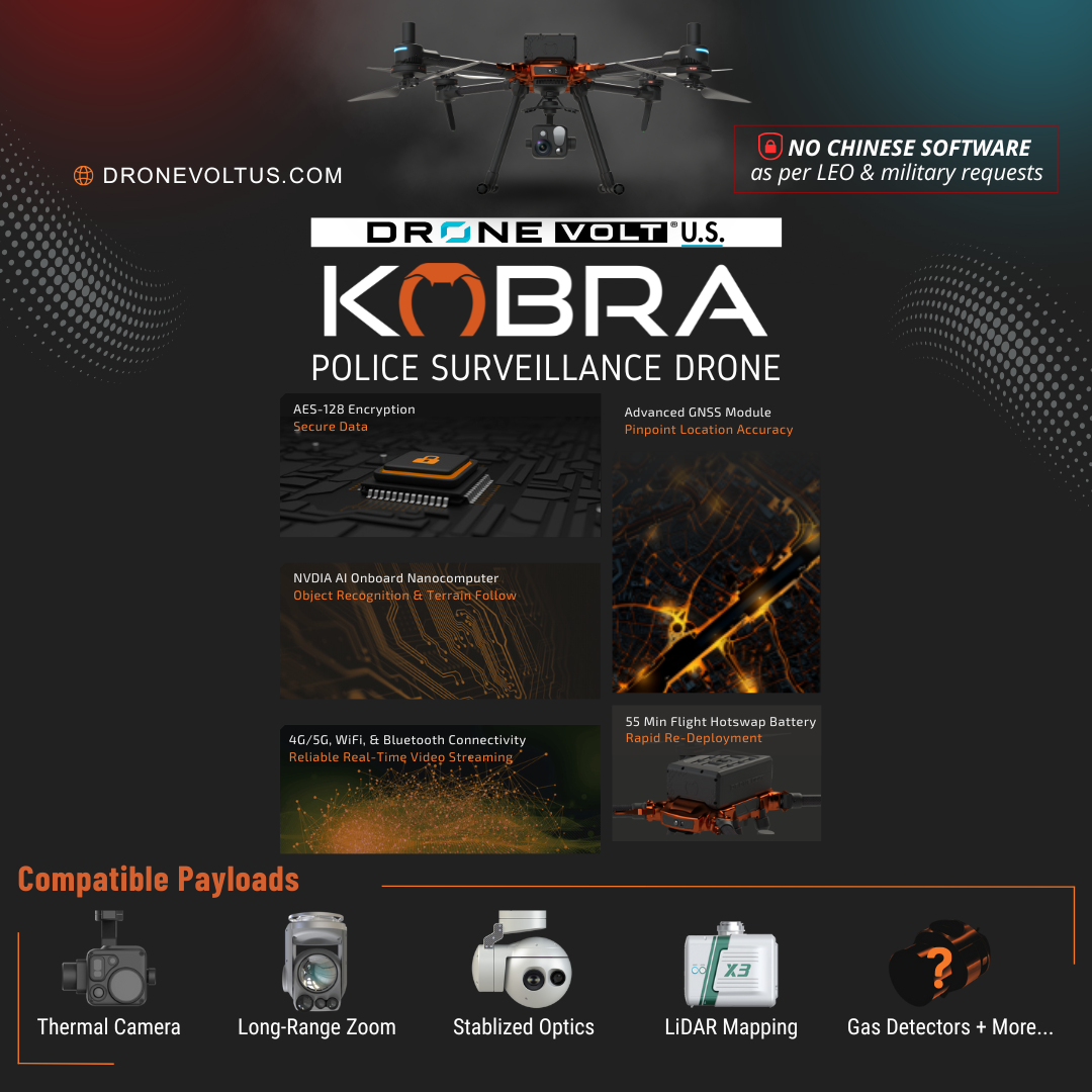 In high-stakes moments, real-time aerial intelligence isn't just helpful—it's critical. The Kobra by Drone Volt U.S. is a cutting-edge surveillance drone built for law enforcement, featuring rapid deployment, AI-powered object recognition, and adaptable payloads—from LiDAR to thermal imaging—for mission success across any scenario. Designed to enhance officer safety and operational awareness, it offers encrypted comms (no Chinese software) modular configurations, and up to 55 minutes of flight time with hot-swappable batteries. When every second counts, the Kobra delivers—fast, flexible, and secure. Discover its mission-ready features now.